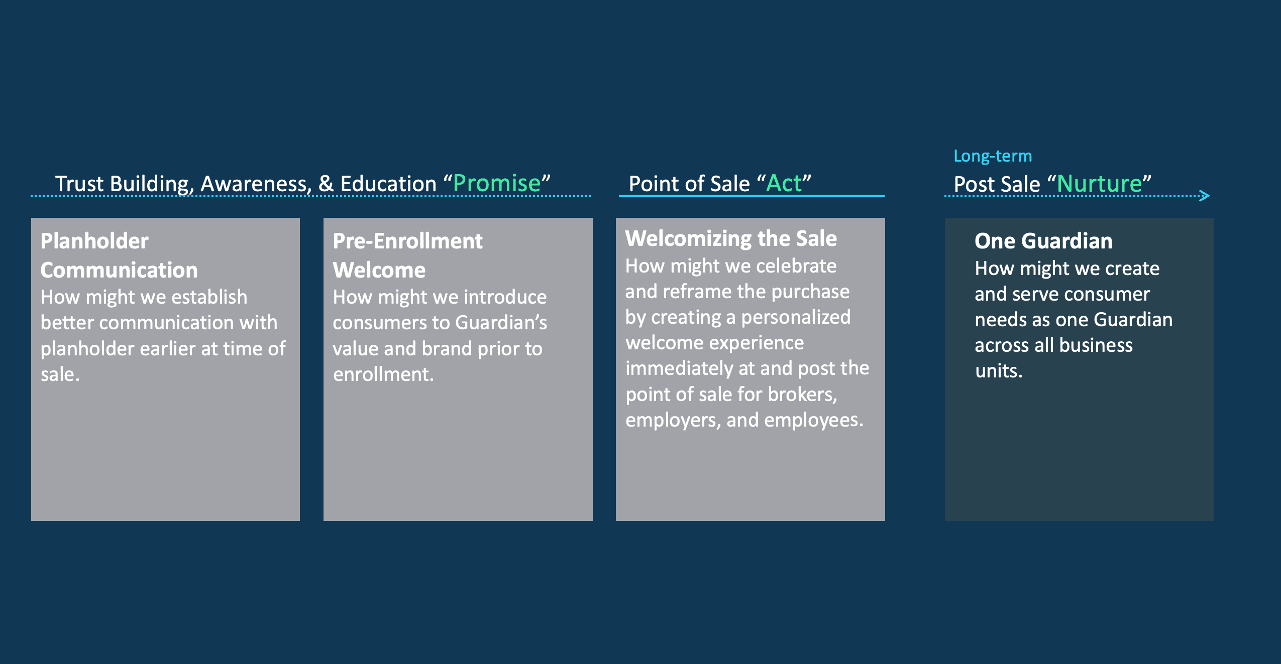 Customer insight, digital product design, and enterprise systems were aligned to simplify navigation, improve benefit understanding, and support more confident coverage decisions. This work established the foundation for a modern, mobile-ready enrollment experience and a scalable model for future service design across Guardian’s ecosystem.