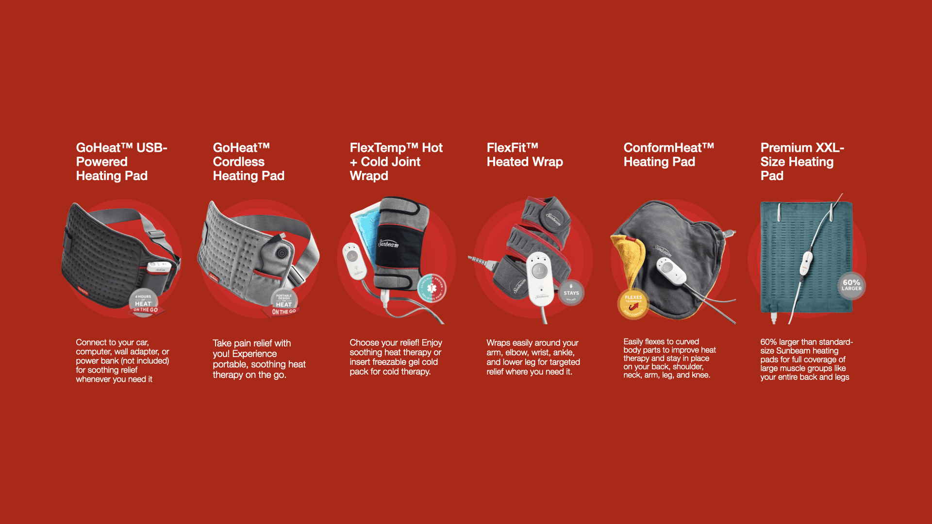 The work translated consumer insight into a scalable pain-relief platform, repositioning Sunbeam from a single-product heating pad brand into a broader wellness and recovery portfolio. By introducing cordless heat and expanding into mobile, wearable use cases, the portfolio increased usage occasions, and enabled growth across joint-specific, wrap-based, hot + cold, and full-coverage formats. This shift established a clear foundation for long-term expansion into adjacent pain relief and wellness categories while reinforcing Sunbeam’s leadership in non-medicated relief for active, everyday lifestyles.