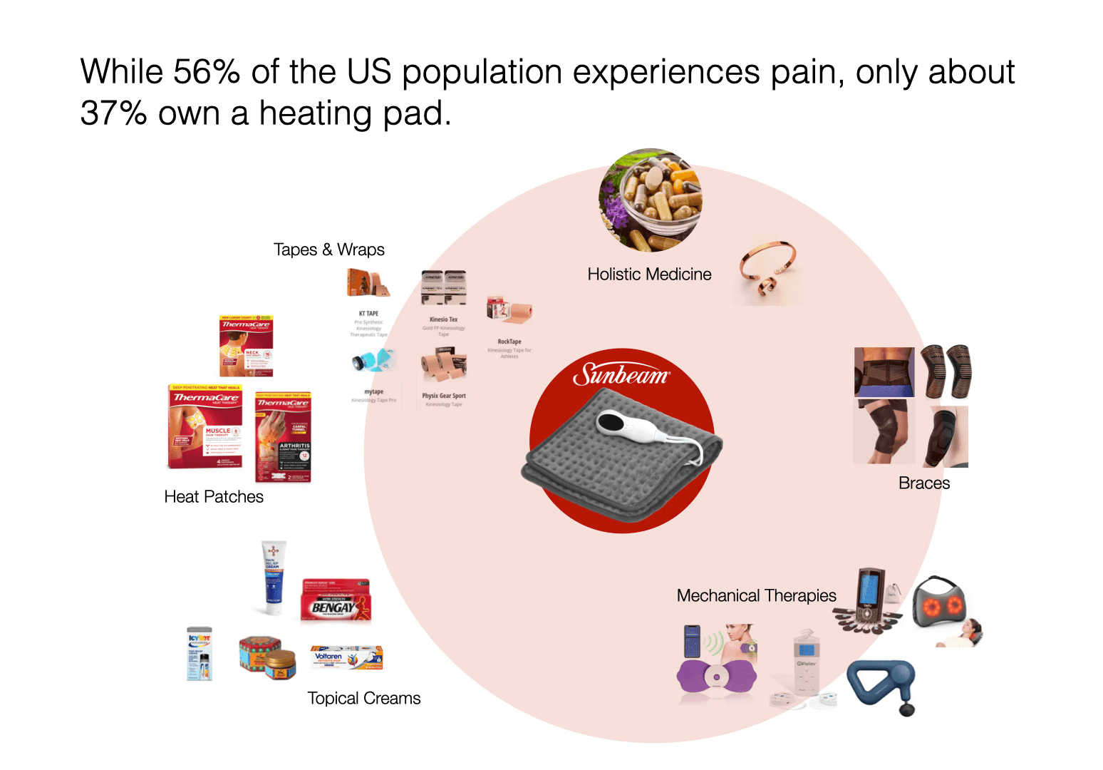 Sunbeam identified emerging growth in heating pad usage among 25 to 45 year old active adults. The pain relief category representing $2B. Sunbeam needed to modernize a legacy category to remain relevant for everyday, active lifestyles.