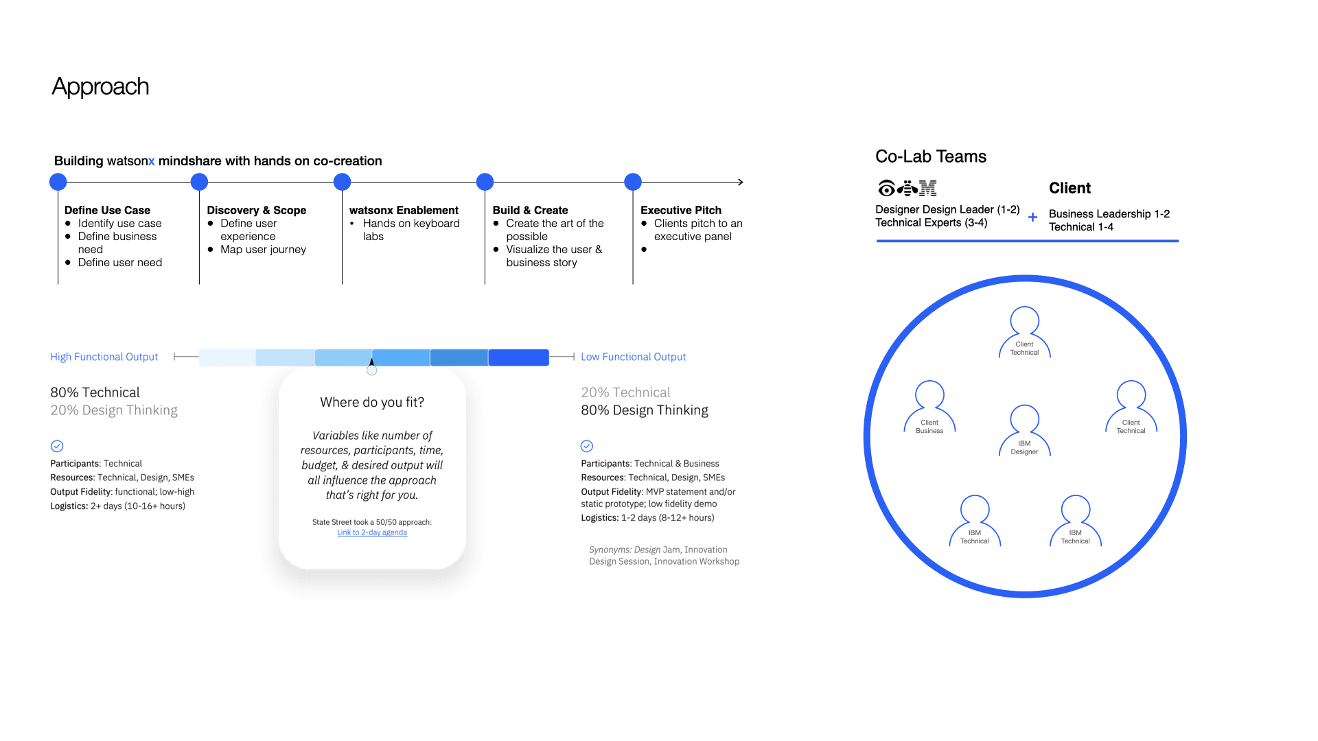 We designed a structured, co-creation engagement that allowed clients to move from exploration to clarity in a short, focused timeframe. Rather than leading with abstract AI concepts, the approach grounded watsonx in the client’s real business context, ensuring relevance, confidence, and shared ownership from the start.